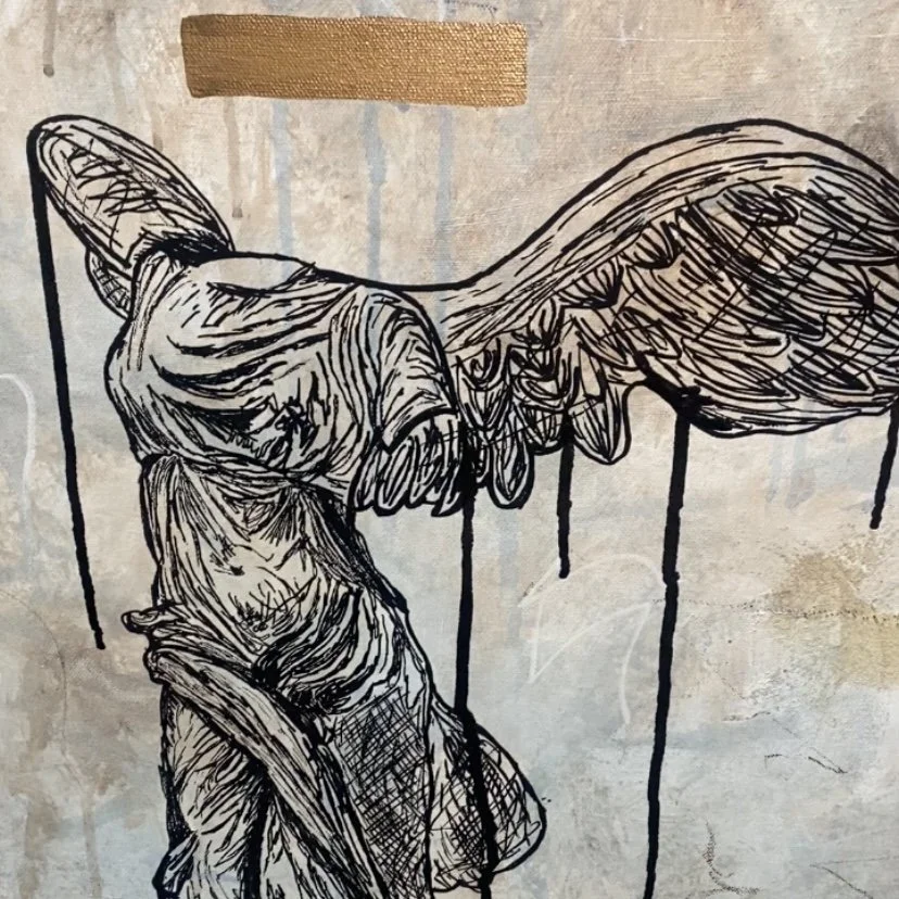 My latest piece, Standing, centers around a familiar yet eternally powerful image: the Winged Victory of Samothrace. Rendered in my own visual language, this work explores not only the classical symbolism of triumph, but what it means to endure, to remain standing, through centuries of erasure, conflict, and silence.